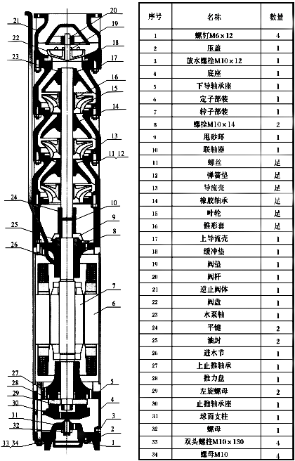 二、主要特點(diǎn) 1. 電機(jī)為充水濕式潛水三相異步電動(dòng)機(jī),電機(jī)腔內(nèi)充滿潔凈清水,用于冷卻電機(jī)和潤(rùn)滑軸承,電機(jī)底部的調(diào)壓膜用于調(diào)整由于電機(jī)溫升變化引起的機(jī)體內(nèi)部水的漲縮壓差。 2. 為了防止井水中的砂粒進(jìn)入電機(jī)內(nèi)部,電機(jī)上端軸伸處裝有兩個(gè)反向安裝的油封,并安裝一甩砂環(huán),組成防砂結(jié)構(gòu)。 3. 為了防止起動(dòng)時(shí)水泵軸上竄,水泵軸和電機(jī)軸由聯(lián)軸器聯(lián)為一體,并在電機(jī)下部安裝一上止推軸承。 4. 電機(jī)和水泵軸承的潤(rùn)滑均為水潤(rùn)滑。 5. 電機(jī)定子繞組采用優(yōu)質(zhì)潛水電機(jī)繞組線,絕緣性能高。 6. 水泵采用離心式葉輪,立式導(dǎo)流殼,結(jié)構(gòu)簡(jiǎn)單。